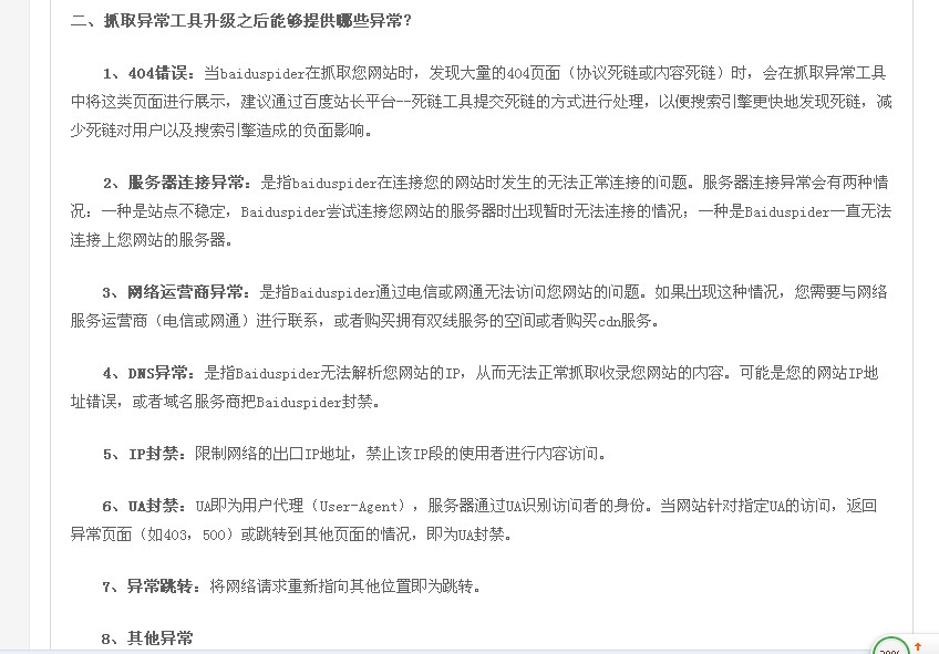 提供这8条异常,对于站长来说,这是异常方便的,我想大家很明白百度这次表达的意思。呈现给我们的是更方便快捷的工具。对于网站后台有一个更好的操作,同时对于百度抓取我们网站有一个更好的诠释。这样的好处就在于避免对网站造成收录及流量的损失。