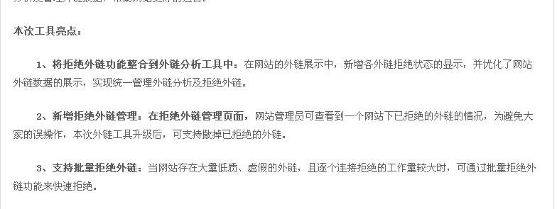 5月28号,百度双外链工具全新升级上线,“外链分析&拒绝外链工具在今天双剑合璧,华丽升级。升级后的外链分析工具可支持批量拒绝外链及撤销拒绝等管理,这是继开放全网外链查询、上线拒绝外链工具之后的又一次大的功能升级,方便站长将站长更好的分析及管理外链数据,帮助网站更好的运营。”这也意味着对于我们站长有很大的帮助,让我们能更轻松便捷的掌握外链操作这一块。同时我想也是提醒各大站长,有垃圾外链的最好用拒绝的方式,不然会给网站带来一些负面影响,我想是帮助同时也是警告。